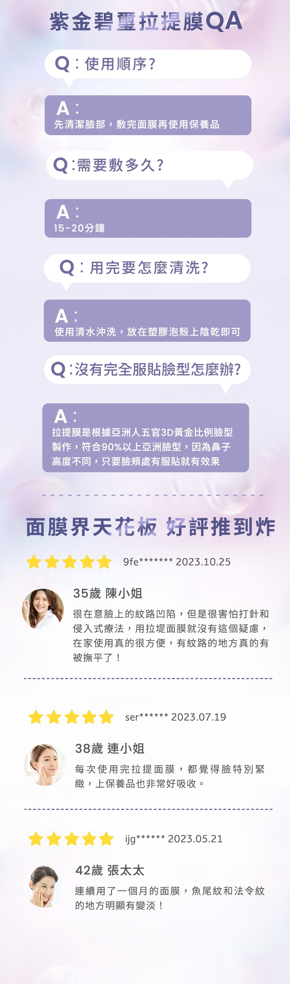 2.清潔臉部後,不需塗抹保養品,保持臉部乾淨,先將面膜下緣勾住下巴,由中間往兩側拉開,再將開孔掛上雙耳,調整產品至臉部肌膚均勻貼覆即可。(勿直接大力拉扯耳掛)
