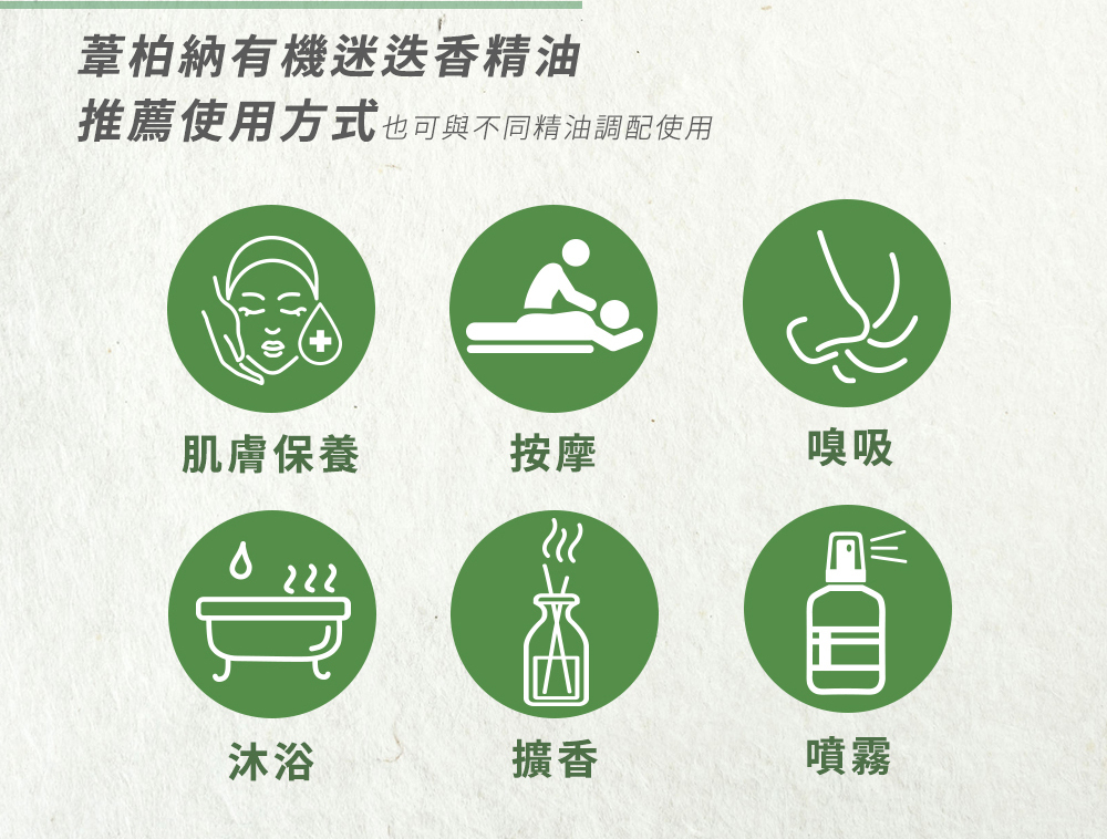 使用方式:少量稀釋於保養品中塗抹於肌膚上、嗅吸、薰香,或是噴灑於空氣中。