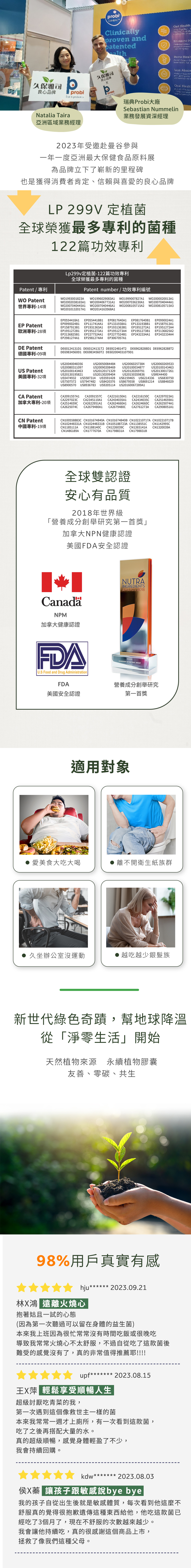 成 分:乳酸菌(胚芽乳酸桿菌)、 Lactiplantibacillus plantarum 299v、麥芽糊精、馬鈴薯澱粉、硬脂酸鎂、全素膠囊殼(羥丙基甲基纖維素、純水、鹿角菜膠、 氯化鉀)